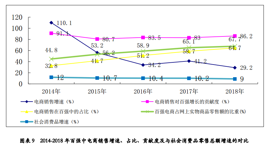 百强中电商销售规模增速也保持同样的增长趋势,近年百强中电商增速持续高于百强中实体店增速,且电商对百强增长的贡献率逐步提升,使得百强企业销售持续保持较快增长,零售百强从“实体拉动”到“电商拉动”的动力转变是百强增速持续较快的主要动因。