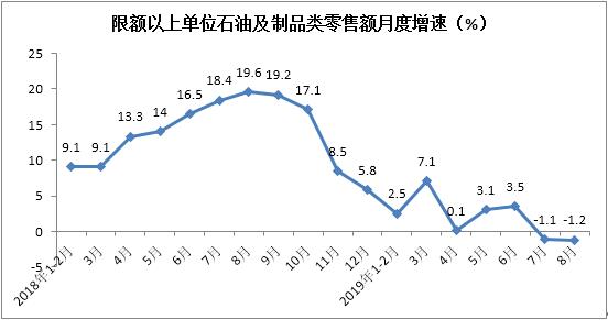 1-8月份限额以上单位石油及制品类零售额实现12948亿元,累计增长2%,增速较1-7月份放缓0.5个百分点。其中,8月份石油及制品零售额同比下降1.2%,降幅较上月扩大0.1个百分点。