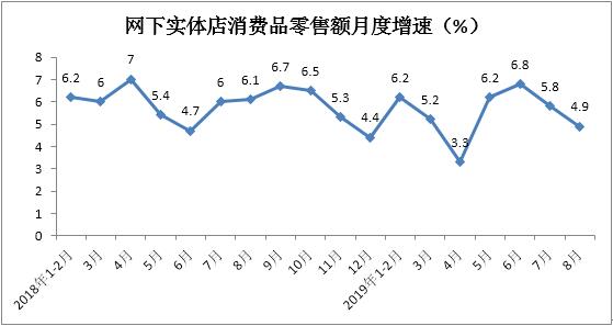 据测算,1-8月份实体店消费品零售额增长5.6%,增速较1-7月份放缓0.1个百分点。其中,8月份同比增长4.9%,增速较上月放缓0.9个百分点。