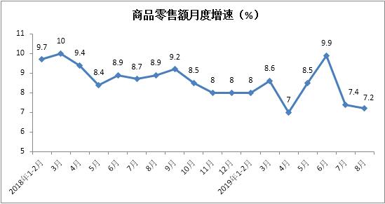 1-8月份商品零售额实现233385亿元,累计增长8.1%,增速较1-7月份放缓0.1个百分点。其中,8月份同比增长7.2%,增速较上月放缓0.2个百分点。