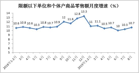 据测算,1-8月份限额以下单位和个体户商品零售额实现145552亿元,累计增长10.7%,增速与1-7月份持平。限额以下单位和个体户商品零售额对商品零售总额增长的贡献率为80.2%,占商品零售总额的比重为62.4%。