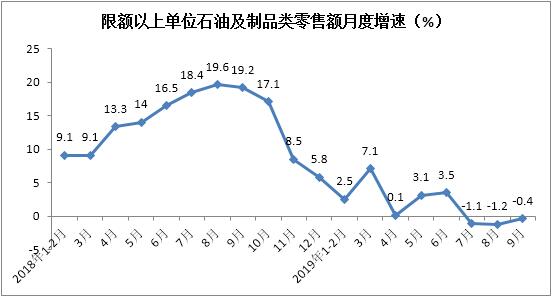 1-9月份限额以上单位石油及制品类零售额实现14697亿元,累计增长1.7%,增速较1-8月份放缓0.3个百分点。其中,9月份石油及制品零售额同比下降0.4%,降幅较上月收窄0.8个百分点。