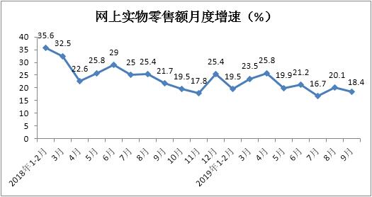 1-9月份网上实物商品零售额实现57777亿元,累计增长20.5%,增速较1-8月放缓0.3个百分点,对社会消费品零售总额增长的贡献率为43.7%,拉动社会消费品零售总额增长3.6个百分点,占社会消费品零售总额的比重达到19.5%,较1-8月份提高0.1个百分点。其中,9月份网上实物商品零售额实现7032亿元,同比增长18.4%,增速较上月放缓1.7个百分点,对社会消费品零售总额长的贡献率为43.8%,拉动社会消费品零售总额增长3.4个百分点,占社会消费品零售总额的比重达到20.4%,较上月提高1.2个百分点。