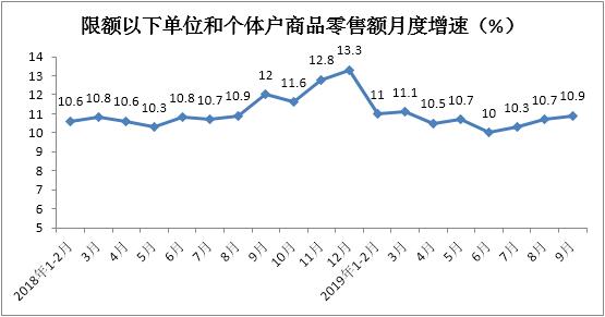 据测算,1-9月份限额以下单位和个体户商品零售额实现164279亿元,累计增长10.7%,增速与1-8月份持平。限额以下单位和个体户商品零售额对商品零售总额增长的贡献率为80.9%,占商品零售总额的比重为62.2%。