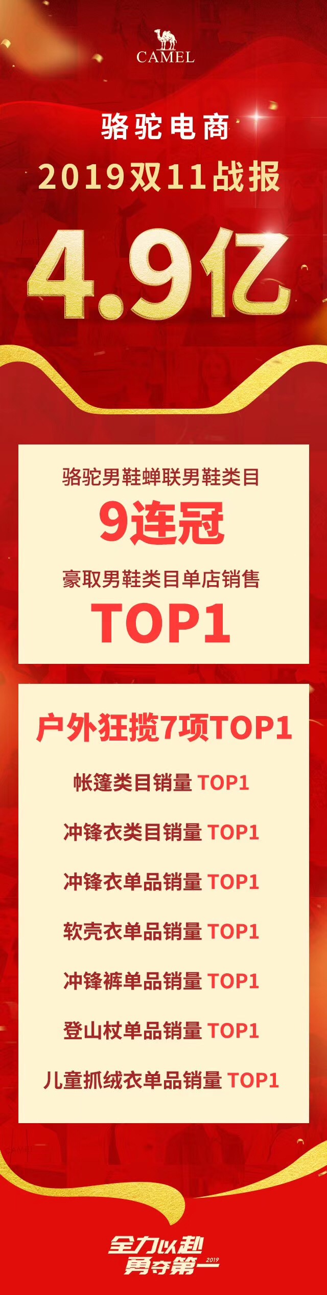 基于CAMEL骆驼多年来的品牌积累,以前瞻性的“全品类”战略布局市场,通过在全球范围内建立优质供应链系统,打造一站式、适应家庭消费场景的购物新体验。在2019年双十一中,骆驼全品类的产品深受广大消费者的喜爱,除了男女鞋、户外两大优势类目外,男装、运动、瑜伽内衣类目在今年双11也有不小的爆发,仅天猫渠道就销售了数百万件商品,其中仅明星同款户外冲锋衣单品销量破4.4万件,销售额达到2000万元,再一次验证了骆驼超强的产品力。