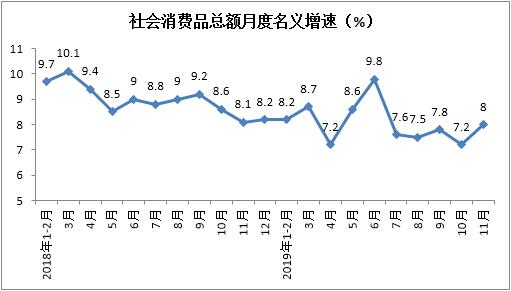 1-11月份我国社会消费品零售总额实现372872亿元,累计增长8%,增速较1-10月份放缓0.1个百分点。其中,11月份同比增长8%,增速较上月加快0.8个百分点。