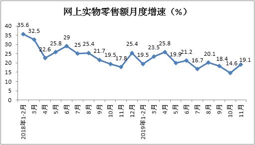 1-11月份网上实物商品零售额实现76032亿元,累计增长19.7%,增速较1-10月放缓0.1个百分点,对社会消费品零售总额增长的贡献率为45.3%,拉动社会消费品零售总额增长3.6个百分点,占社会消费品零售总额的比重达到20.4%,比1-10月份提高0.9个百分点。其中,11月份网上实物商品零售额实现10860亿元,同比增长19.1%,增速较上月加快4.5个百分点,对社会消费品零售总额长的贡献率为61.7%,拉动社会消费品零售总额增长4.9个百分点。