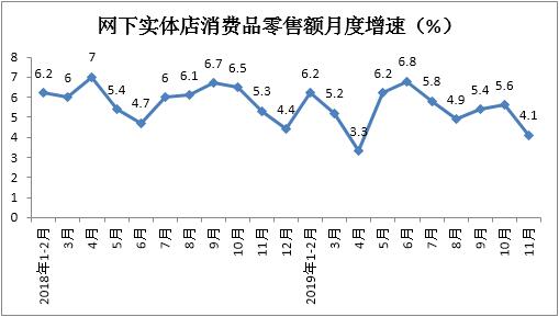 据测算,1-11月份实体店消费品零售额增长5.4%,增速较1-10月份放缓0.2个百分点。其中,11月份同比增长4.1%,增速较上月放缓1.4个百分点。