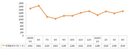4月份,30家大型百货企业防寒服成交均价1530元,环比提高9.6%。其中,成交价在2000元以上的防寒服销售占比达到69.8%,环比提高6.1个百分点。