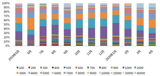 图6:2019年5月-2020年4月30家大型实体门店服装价位结构