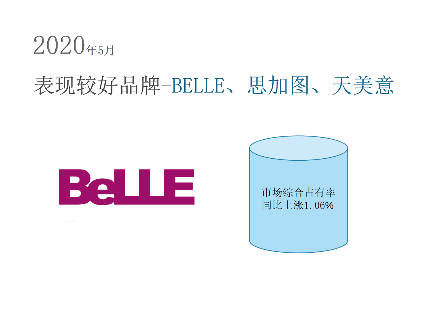 百丽集团专注中高端皮鞋,通过品牌和渠道的不断完善占据国内女鞋市场较大优势,其中BELLE市场综合占有率与同期相比提高1.06%。思加图、天美意品牌也表现良好,市场综合占有率与同期相比分别提高0.35%、0.31%。