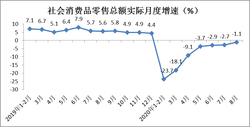 1-8月份,城镇消费品零售额206643亿元,同比下降8.7%,降幅较1-7月份收窄1.3个百分点;乡村消费品零售额31386亿元,同比下降8.3%,降幅较1-7月份收窄1.2个百分点。其中,8月份城镇消费品零售额同比增长0.5%,增速环比提高1.6个百分点;乡村消费品零售额同比增长0.7%,增速环比提高2个百分点。
