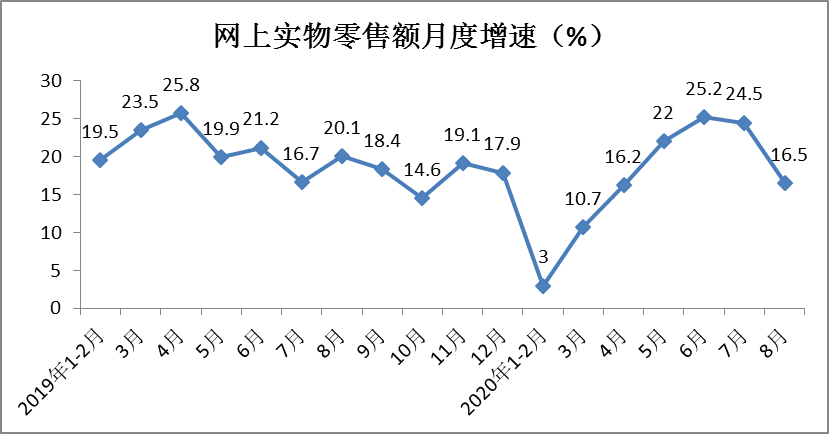 1-8月份网上实物商品零售额实现58651亿元,同比增长15.8%,增速较1-7月份加快0.1个百分点,占社会消费品零售总额的比重为24.6%。其中,8月份网上实物商品零售额增长16.5%,增速环比放缓8个百分点,较上年同期放缓3.6个百分点。