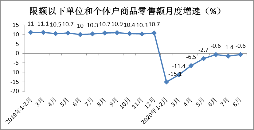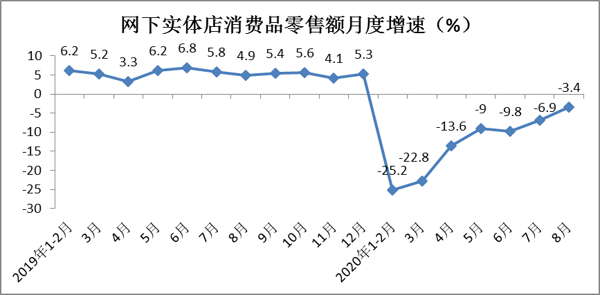 根据测算,1-8月份实体店消费品零售额同比下降14.5%,降幅较1-7月份收窄1.6个百分点。其中,8月份同比下降3.4%,降幅环比收窄3.5个百分点。