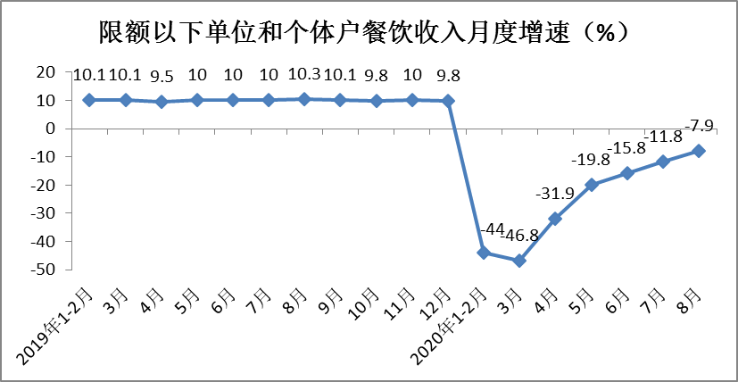 据测算,1-8月份限额以下单位和个体户餐饮收入实现16882亿元,同比下降27.3%,降幅较1-7月份收窄3个百分点。限额以下单位和个体户餐饮收入占餐饮收入总额的比重为78.5%,较1-7月份下降0.1个百分点。其中,8月份限额以下单位和个体户餐饮收入同比下降7.9%,降幅环比收窄3.9个百分点。