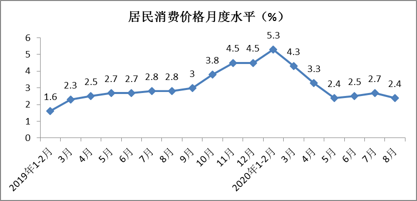 1-8月份,全国居民消费价格累计上涨3.5%,涨幅较上年同期扩大1.1个百分点,较1-7月份回落0.2个百分点。其中,食品价格上涨15.2%,涨幅较上年同期扩大9.3个百分点;非食品价格上涨0.5%,涨幅较上年同期缩小1个百分点。消费品价格上涨5.2%,涨幅扩大2.6个百分点;服务价格上涨0.7%,涨幅收窄1.3个百分点。其中,8月份居民消费价格同比上涨2.4%,涨幅环比回落0.3个百分点。