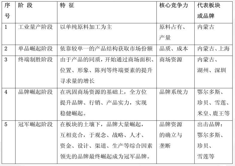 中国羊绒行业的发展有先天的优势,全球70%羊绒原料来自于中国,并且中国羊绒原料品质远超国外,原料优势带来了这个行业的快速发展,主要分为五个阶段(见下图):一开始是以原料加工为主,逐渐开始尝试产品创新单品崛起,由于同质化严重,开始通过渠道拓展、引入商场资源稳固市场,从而逐渐形成品牌效应、品牌板块和冠军品牌,羊绒行业发展为止已成为比较活跃的零售品牌。