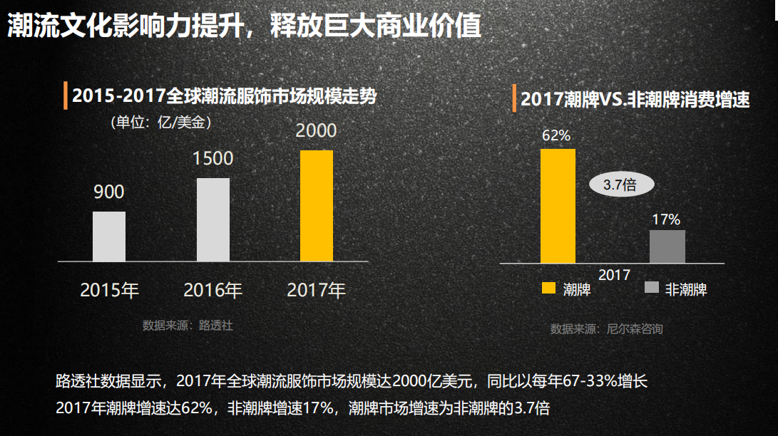 上图两个数据表现了全球潮流消费的走势。第一,据路透社统计,2015年到2017年全国潮流服饰的消费,从900亿美金上升到2000亿美金,同比增长每年67-33%,增长速度是非常快的。潮牌增长的速度是非潮牌的3.7倍,潮牌领域有快速的增长。第二,年轻一代、九零后成为主要的潮流品牌消费的中流砥柱,九零后消费是七零后的两倍,Z世代正是潮流服饰发展的主要消费群体。