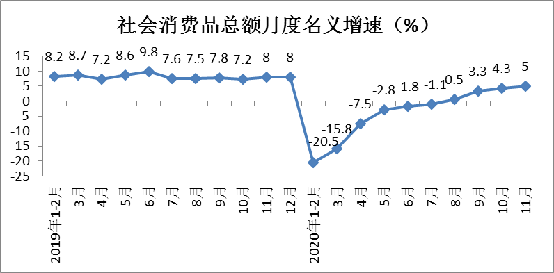 1-11月份,我国社会消费品零售总额实现351415亿元,较上年同期下降4.8%,降幅较1-10月份收窄1.1个百分点。其中,11月份同比增长5%,增速环比提高0.7个百分点,连续第四个月实现同比正增长,且增速持续加快。除汽车以外,1-11月份消费品零售额316884亿元,同比下降5%,降幅环比收窄1个百分点。