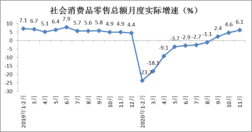 扣除价格因素,11月份社会消费品零售总额同比增长6.1%,增速较上月加快1.5个百分点。