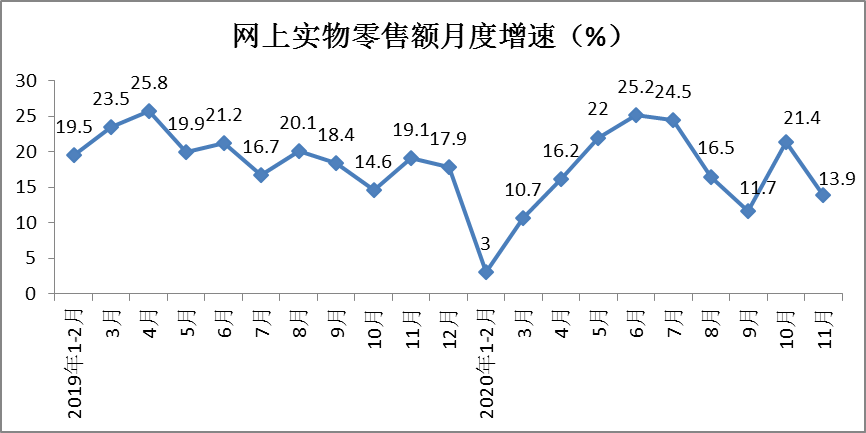 1-11月份网上实物商品零售额实现87792亿元,同比增长15.7%,增速较1-10月份放缓0.3个百分点,占社会消费品零售总额的比重为25%。其中,11月份网上实物商品零售额增长13.9%,增速环比放缓7.5个百分点,低于上年同期5.2个百分点。