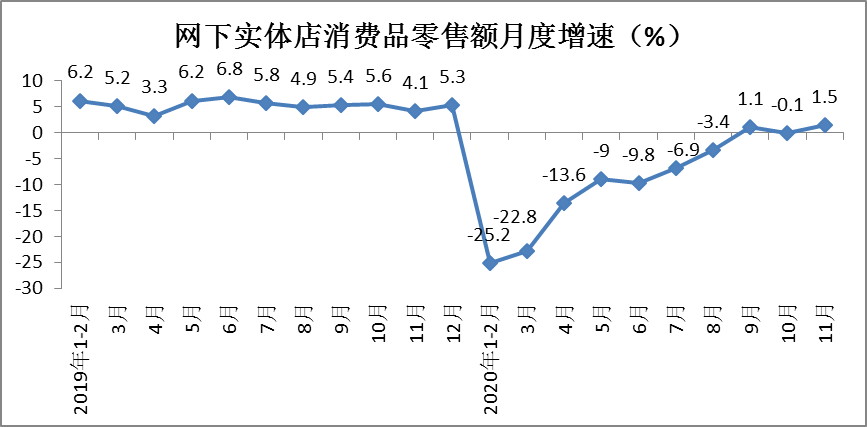 根据测算,1-11月份实体店消费品零售额同比下降10.1%,降幅较1-10月份收窄1.2个百分点。其中,11月份同比增长1.5%,增速环比提高1.6个百分点。