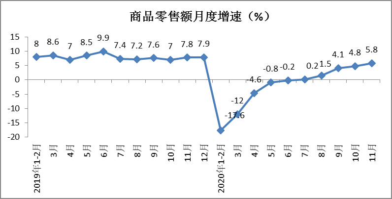 1-11月份,商品零售316837亿元,同比下降3%,降幅较1-10月份收窄1个百分点。其中,11月份商品零售34534亿元,同比增长5.8%,增速环比提升1个百分点。