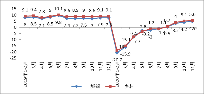 1-11月份,城镇消费品零售额304413亿元,同比下降4.9%,降幅较1-10月份收窄1.1个百分点;乡村消费品零售额47002亿元,同比下降4.3%,降幅较1-10月份收窄1.1个百分点。其中,11月份城镇消费品零售额同比增长4.9%,增速环比提高0.7个百分点;乡村消费品零售额同比增长5.6%,增速环比提高0.5个百分点,快于城镇0.7个百分点。