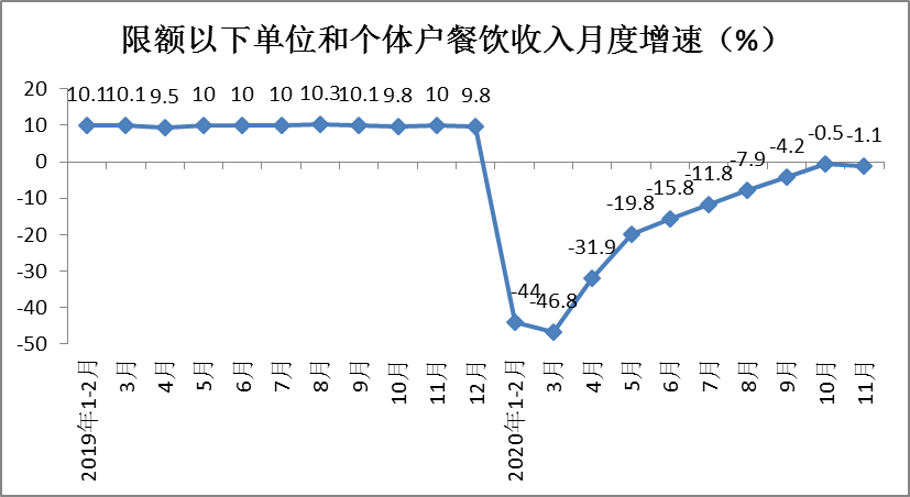 1-11月份,餐饮收入34578亿元,同比下降18.6%,降幅较1-10月份收窄2.4个百分点。其中,11月份餐饮收入4980亿元,同比下降0.6%,增速环比回落1.4个百分点。