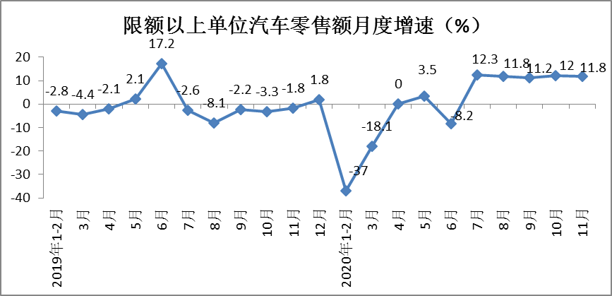 1-11月份,限额以上单位汽车类零售额实现34531亿元,同比下降2.8%,降幅较1-10月份收窄1.7个百分点。其中,11月份汽车类零售额同比增长11.8%,连续五个月实现两位数增长。