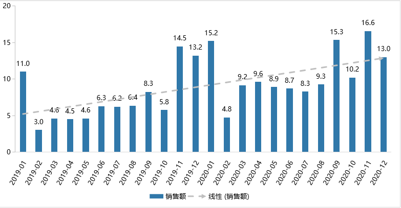 图表 3? 2019、2020年重点线上平台零食市场月度销售额走势[2]