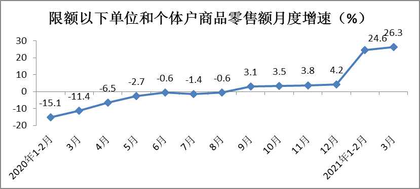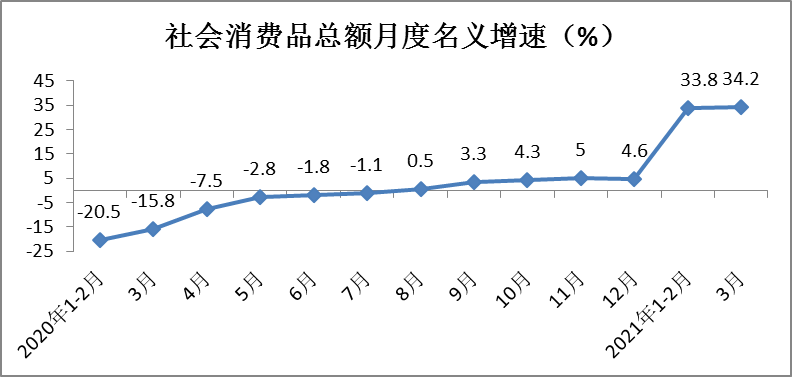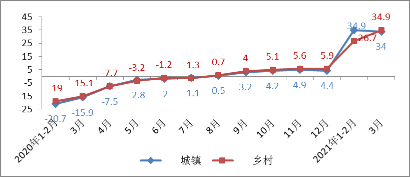 一季度城镇消费品零售额91345亿元,同比增长34.6%,据测算,较2019年同期增长8.8%,两年平均增长4.3%;乡村消费品零售额13875亿元,同比增长29.4%,据测算,较2019年同期增长6.5%,两年平均增长3.2%。