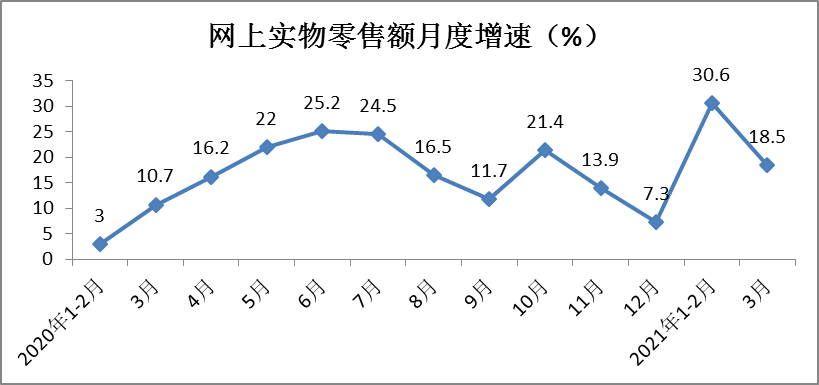一季度网上实物商品零售额实现23067亿元,同比增长25.8%,较2019年增长33.2%,两年平均增长15.4%,增速较1-2月份放缓4.8个百分点。一季度网上实物商品零售额占社会消费品零售总额的比重为21.9%,占比较上年同期下降1.7个百分点。其中,吃类、穿类和用类商品分别增长30.5%、39.6%和21.4%,两年平均分别增长31.6%、8.9%和15.6%。