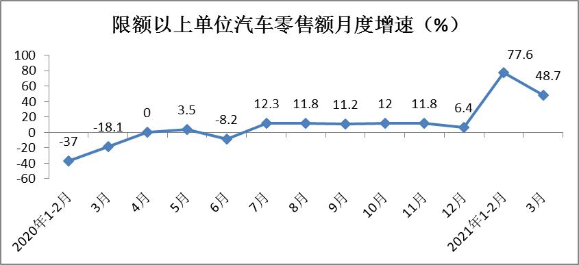 一季度限额以上单位汽车类零售额实现10609亿元,同比增长65.6%,较1-2月份放缓12个百分点。