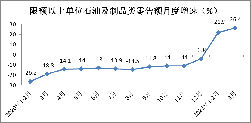 一季度限额以上单位石油及制品类零售额实现4487亿元,同比增长23.6%,较1-2月份提高1.7个百分点。