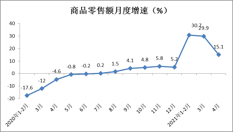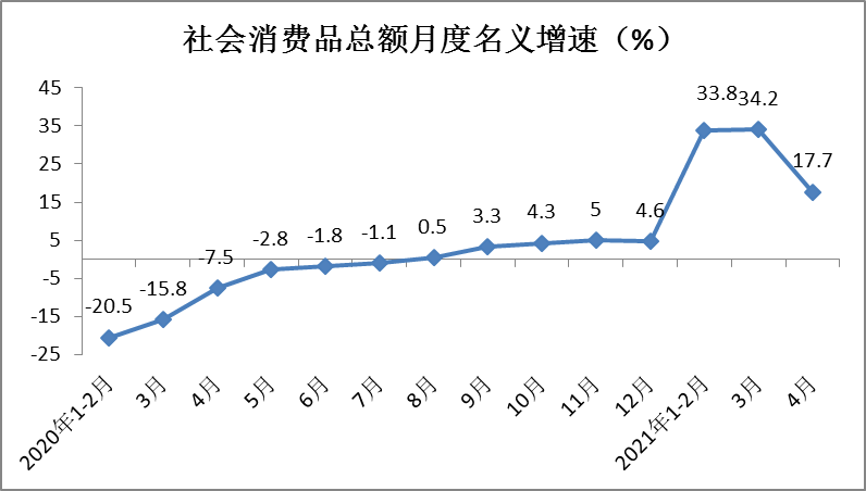 1—4月份,城镇消费品零售额120233亿元,同比增长30.1%,两年平均增长4.3%,两年平均增速与一季度持平;乡村消费品零售额18140亿元,增长26.5%,两年平均增长3.4%,两年平均增速较一季度加快0.2个百分点。