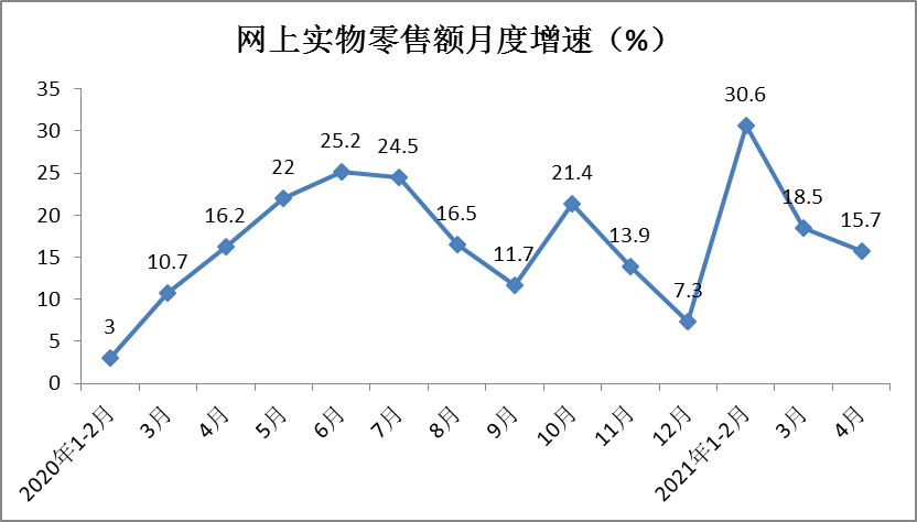 1-4月份,网上实物商品零售额实现30774亿元,同比增长23.1%,两年平均增长15.6%,两年平均增速较一季度加快0.2个百分点。1-4月份,网上实物商品零售额占社会消费品零售总额的比重为22.2%,占比较上年同期下降1.9个百分点,较一季度提高0.3个百分点。其中,吃类、穿类和用类商品分别增长24.5%、33.8%和20%,两年平均分别增长30.4%、8.5%和16.2%。