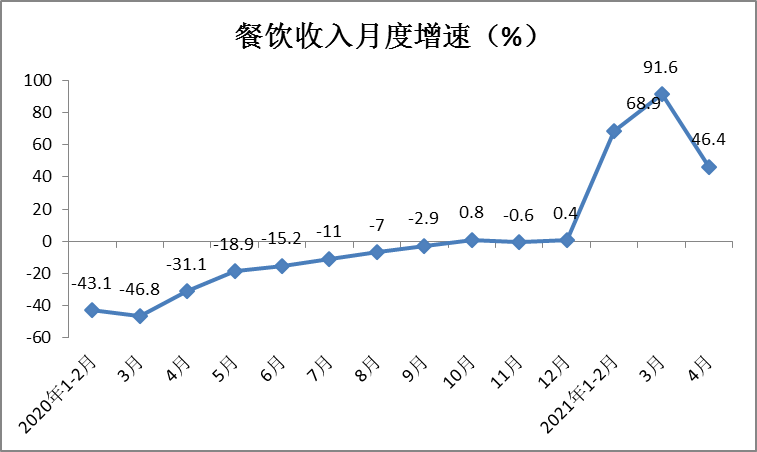 1-4月份,餐饮收入13973亿元,增长67.7%,两年平均下降0.7%,降幅较一季度收窄0.3个百分点。其中,限额以上单位餐饮收入3106亿元,同比增长72.7%,增幅大于餐饮收入整体增幅5个百分点。