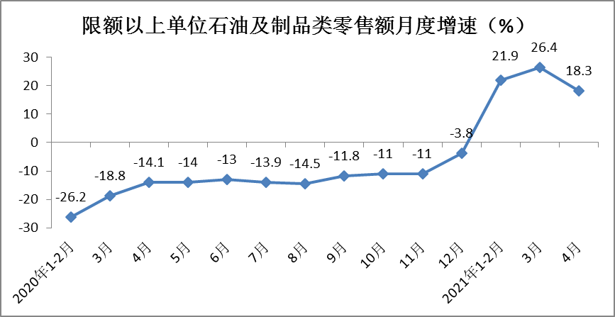 1-4月份限额以上单位石油及制品类零售额实现6102亿元,累计增长22.1%,较一季度放缓1.5个百分点。