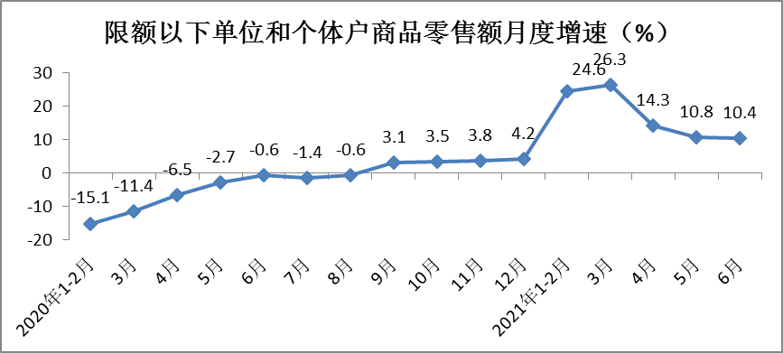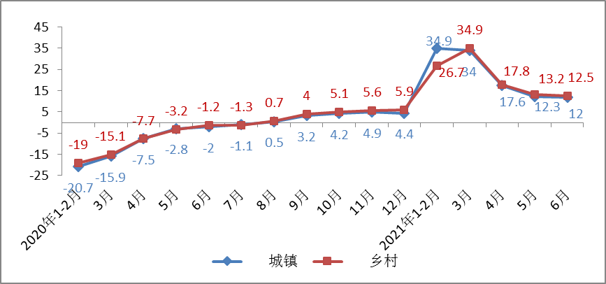 上半年,城镇消费品零售额184098亿元,同比增长23.3%,两年平均增长4.4%,两年平均增速与1-5月份持平;乡村消费品零售额27807亿元,增长21.4%,两年平均增长4%,两年平均增速较1-5月份加快0.3个百分点。