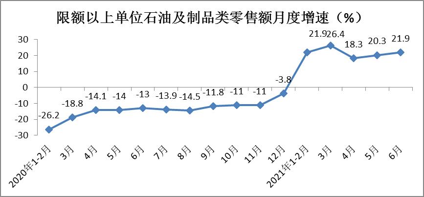 上半年限额以上单位石油及制品类零售额实现9673亿元,累计增长21.7%,增速与1-5月份持平。6月份,限额以上单位石油及制品类零售额同比增长21.9%,增速环比提高1.6个百分点。