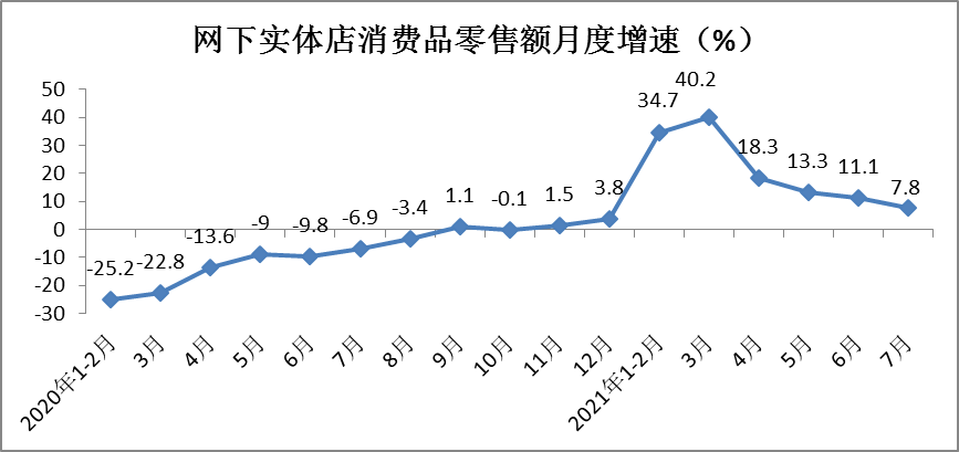 根据测算,1-7月份实体店消费品零售额188699亿元,同比增长21.7%,增速较1-6月份放缓2.7个百分点。7月份实体店消费品零售额27058亿元,同比增长7.8%,增速环比放缓3.3个百分点。