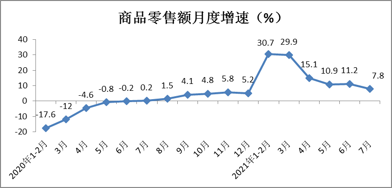1-7月份,我国社会消费品零售总额实现246829亿元,较上年同期增长20.7%,两年平均增速为4.3%,两年平均增速较1-6月份放缓0.1个百分点。其中,除汽车以外的消费品零售额221631亿元,增长20.2%,增速较1-6月份放缓2个百分点。7月份,我国社会消费品零售额34925亿元,同比增长8.5%,增速环比放缓3.6个百分点;和2019年同期相比,增长7.2%,增速环比放缓2.8个百分点;两年平均增速为3.6%,增速环比放缓1.3个百分点。