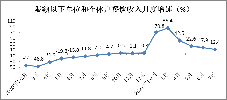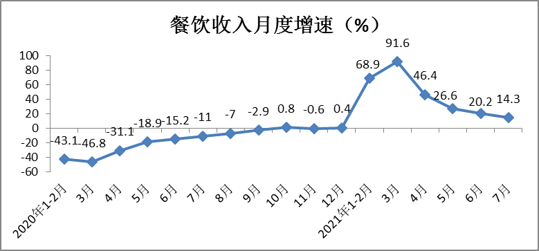 1-7月份,餐饮收入25463亿元,同比增长42.3%,增速较1-6月份放缓6.3个百分点。其中,限额以上单位餐饮收入5842亿元,同比增长49.5%,增速较1-6月份放缓6.8个百分点。其中,7月份餐饮收入3751亿元,同比增长14.3%,增速环比放缓5.9个百分点。
