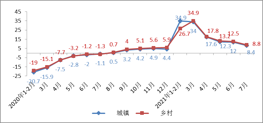 1-7月份,城镇消费品零售额214476亿元,同比增长20.9%,增速较1-6月份放缓2.4个百分点。乡村消费品零售额32353亿元,增长19.4%,增速较1-6月份放缓2个百分点。