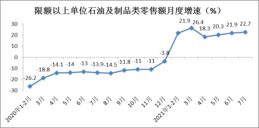 1-7月份,限额以上单位石油及制品类零售额实现11382亿元,同比增长21.9%,增速较1-6月份提高0.2个百分点。7月份,限额以上单位石油及制品类零售额同比增长22.7%,增速环比提高0.8个百分点。