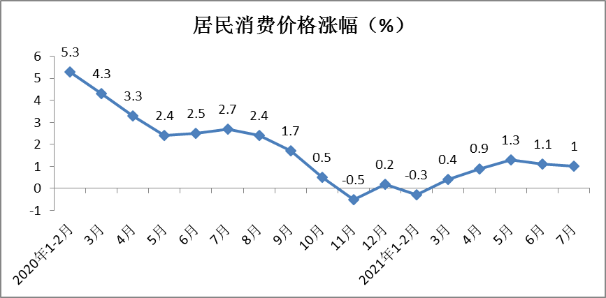 1-7月份,全国居民消费价格同比上涨0.6%,涨幅较上年放缓3.1个百分点,较1-6月份提高0.1个百分点。其中食品价格同比下降0.7%,增速较上年同期回落16.5个百分点,较1-6月份下降0.5个百分点;非食品价格同比上涨0.9%,涨幅较上年同期提高0.3个百分点,较1-6月份提高0.2个百分点。消费品价格同比上涨0.6%,涨幅较上年同期回落4.8个百分点,较1-6月份放缓0.1个百分点;服务价格同比增长0.5%,涨幅较上年同期回落0.3个百分点,较1-6月份提高0.2个百分点。