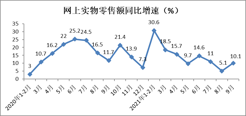 前三季度,实物商品网上零售额实现91871亿元,同比增长15.2%,增速较1-8月份放缓0.7个百分点,低于社会消费品零售总额增速1.2个百分点。实物商品网上零售额占社会消费品零售总额的比重为23.6%,占比与上月持平。其中,吃类、穿类和用类商品分别增20.2%、15.6%和14.5%。经测算,9月份实物商品网上零售额实现8702亿元,同比增长10.1%,增速较8月份加快5个百分点。