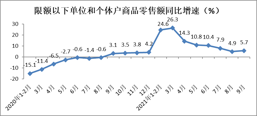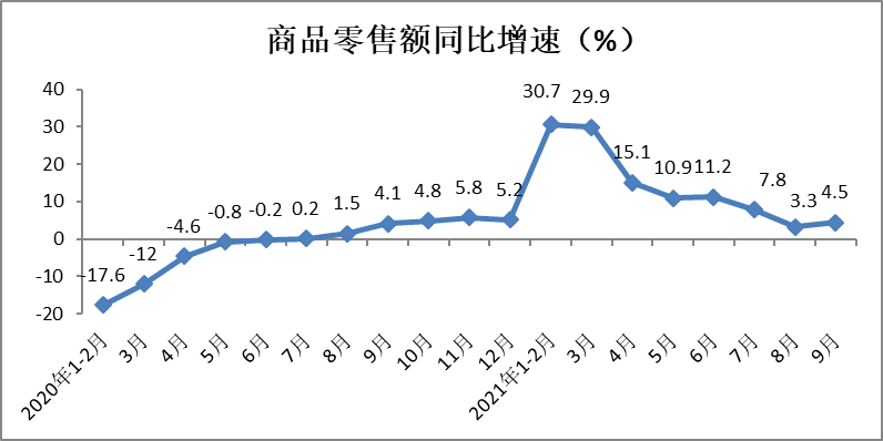 9月份,商品零售33002亿元,同比增长4.5%,增速较8月份加快1.2个百分点。其中,限额以上单位商品零售12999亿元,同比增长2.7%,增速较8月份加快1.9个百分点。