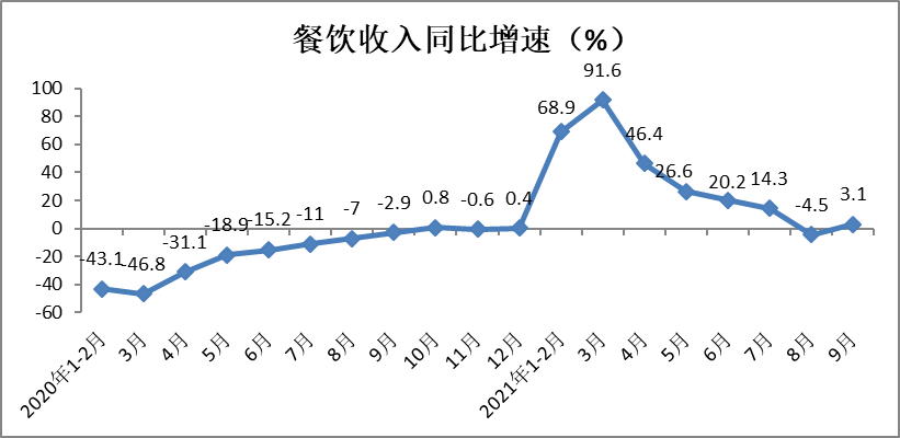 前三季度,餐饮收入32750亿元,同比增长29.8%,增速较1-8月份放缓4.6个百分点。其中,限额以上单位餐饮收入7553亿元,同比增长34.8%,增速较1-8月份放缓5.4个百分点。其中,9月份餐饮收入3831亿元,同比增长3.1%,增速较8月份加快7.6个百分点。